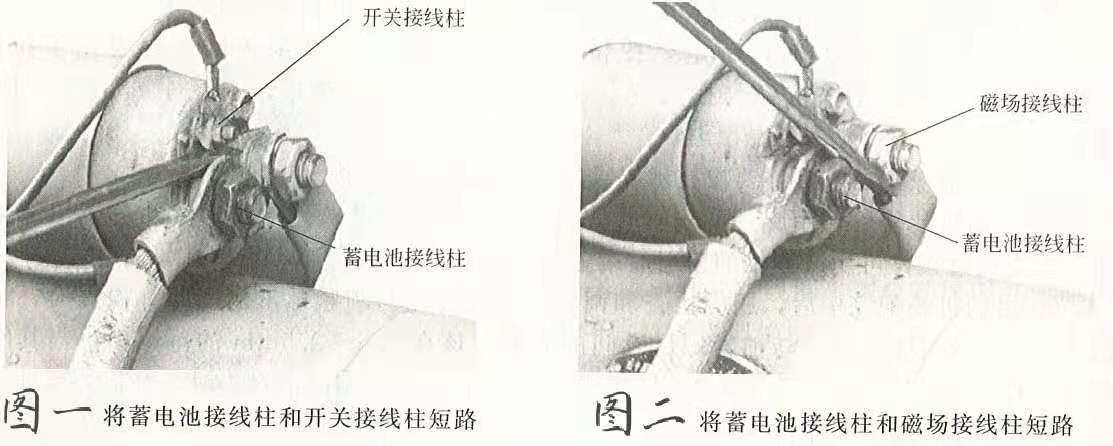 6.用旋具再將蓄電池接線柱和磁場接線柱短路。若啟動機正常運轉,則說明電磁開關內部有故障,應拆下電磁開關,檢查電磁開關內部的活動觸頭和兩個靜觸頭的燒損情況及磁力線圈是否燒損等。如啟動機仍不運轉,且在短路時無火花出現,則說明啟動機內部出現斷路故障;若火花出現,則說明啟動機內部出現短路現象,應將啟動機拆下后進行修理。